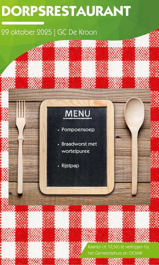 🎫 Kaarten zijn verkrijgbaar bij de snelbalies van het Gemeentehuis in Bocholt en het OCMW in Kaulille tot de vrijdag voor het Dorpsrestaurant (deze maand t.e.m. 24.10.2025)